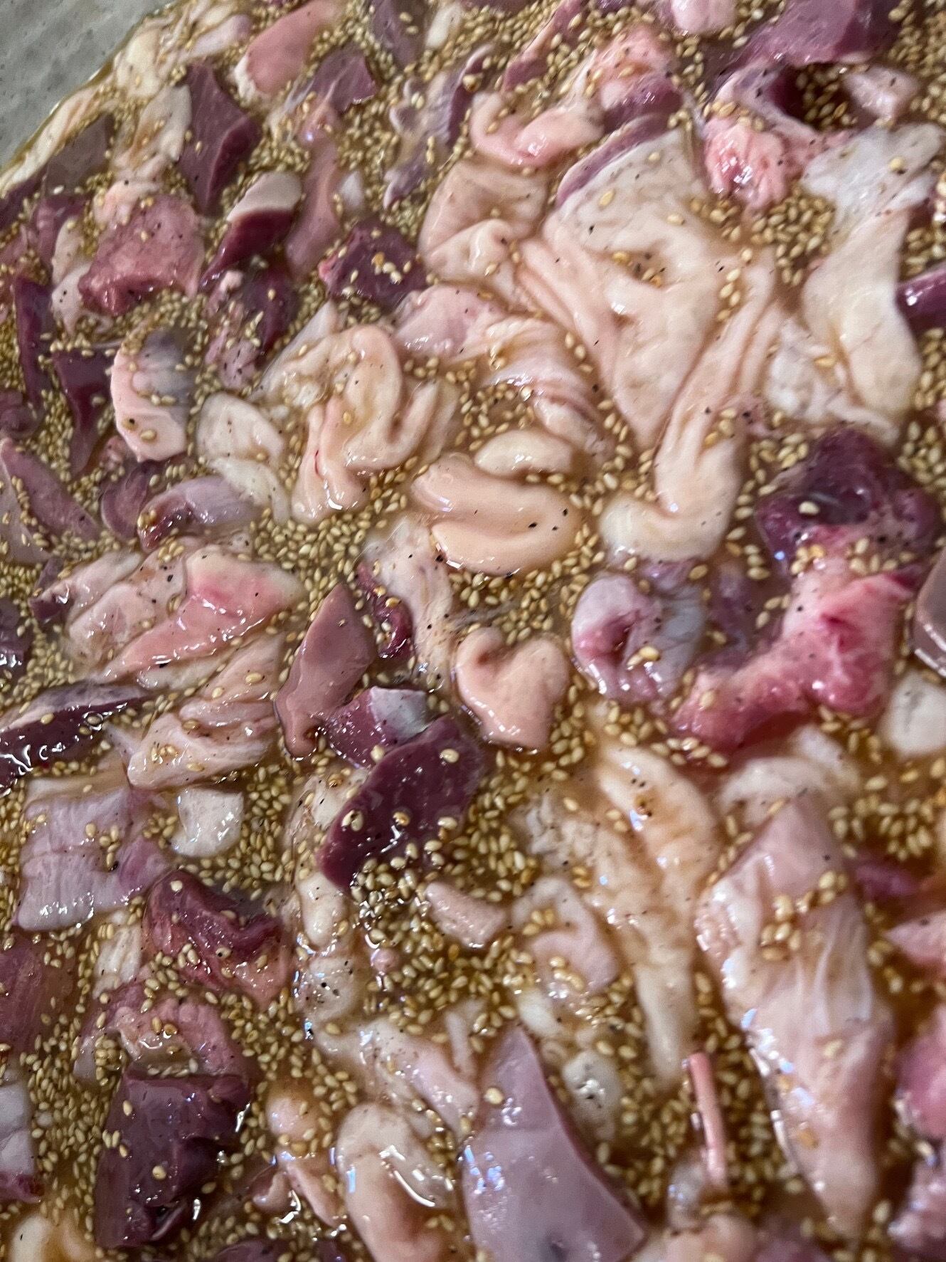 6種類の新鮮な豚ホルモンを使った塩味ベースのミックスホルモンです。豚大腸、豚タン、豚ハツ、コブクロ、ガツ、レバーを使用し、プリプリ、コリコリ、シコシコ、など、様々な食感が味わえます。バランスのとれた濃厚な味わいが楽しめる一品です。